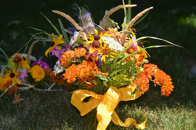 The bouquet and centerpieces, posing on the lawn, much like a bride and her wedding party.